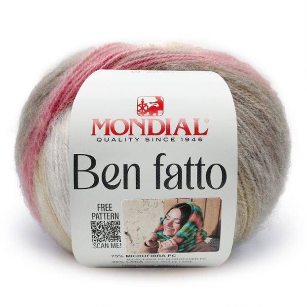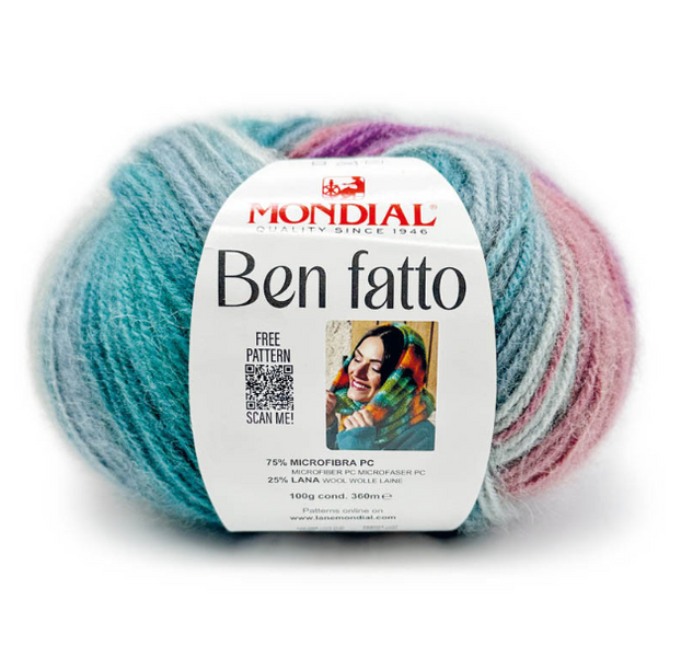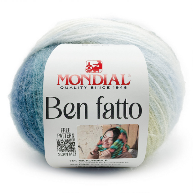 Ben Fatto by Mondial è un filo semplice e d’effetto, un garzato stampato con toni multicolor vivaci che, anche con lavorazioni semplici, vi permetterà di ottenere capi di grande impatto. Facile da lavorare, quindi adatto anche a chi per la prima volta si approccia al mondo della maglia e dell’uncinetto, è un filo estremamente versatile che si presta alla realizzazione di maglie, cardigan e accessori di vario genere.