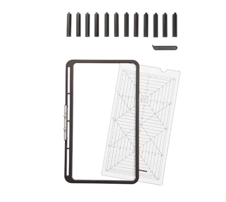 Telaio medio per bordure con morsetti Bernina, compatibile con Bernina serie 7/8/9. Il telaio perfetto per chi cuce quilt: -Ideale per combinazioni di disegni e motivi quilt di grandi dimensioni -Semplice da inserire e posizionare -Permette di risparmiare tessuto e stabilizzatore -Incluso strumento per la rimozione dei morsetti -Area massima di ricamo: 215 x 405 mm Codice:1074117000