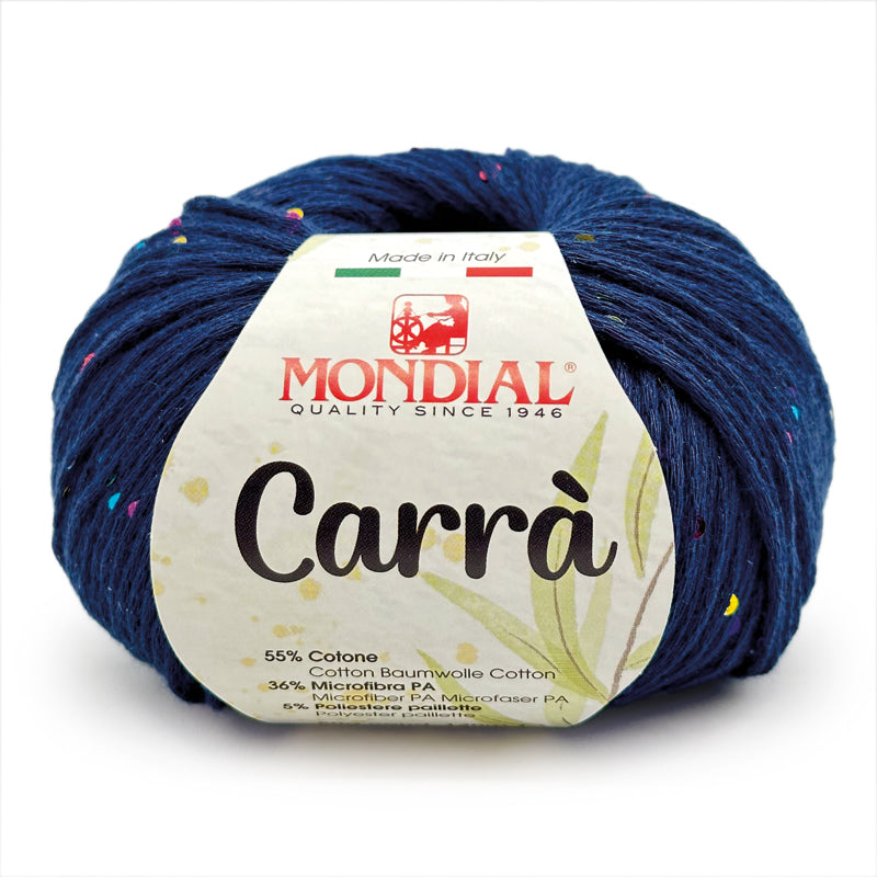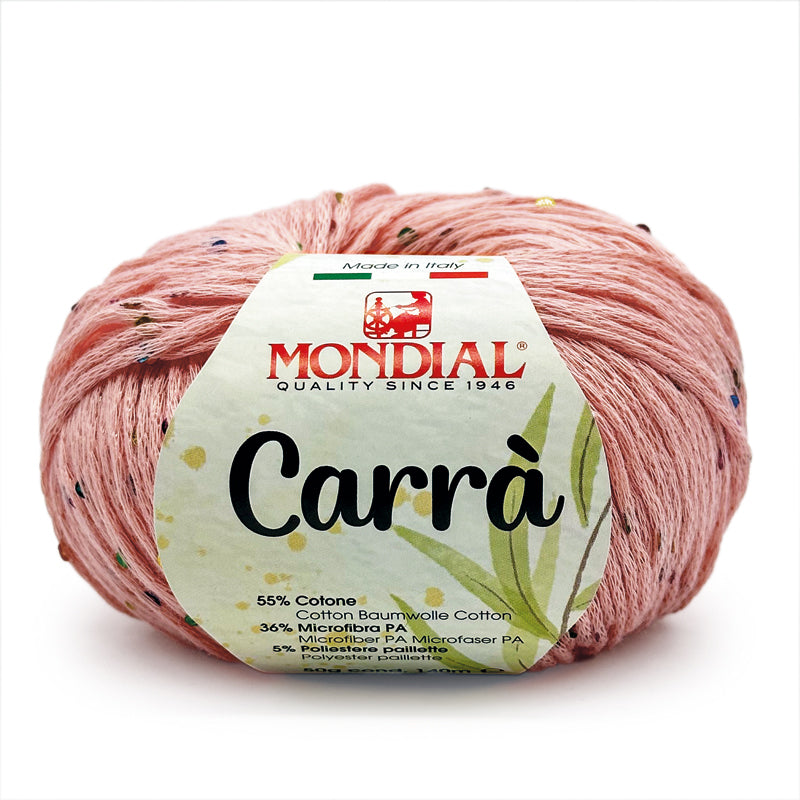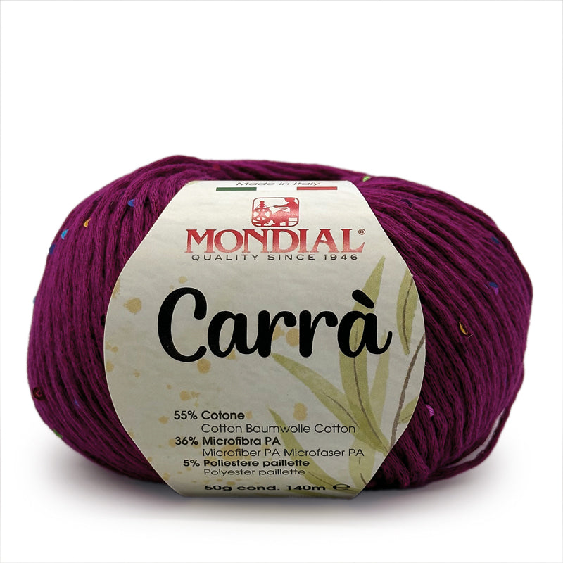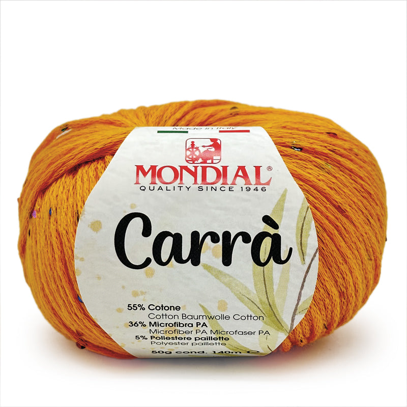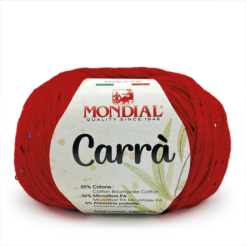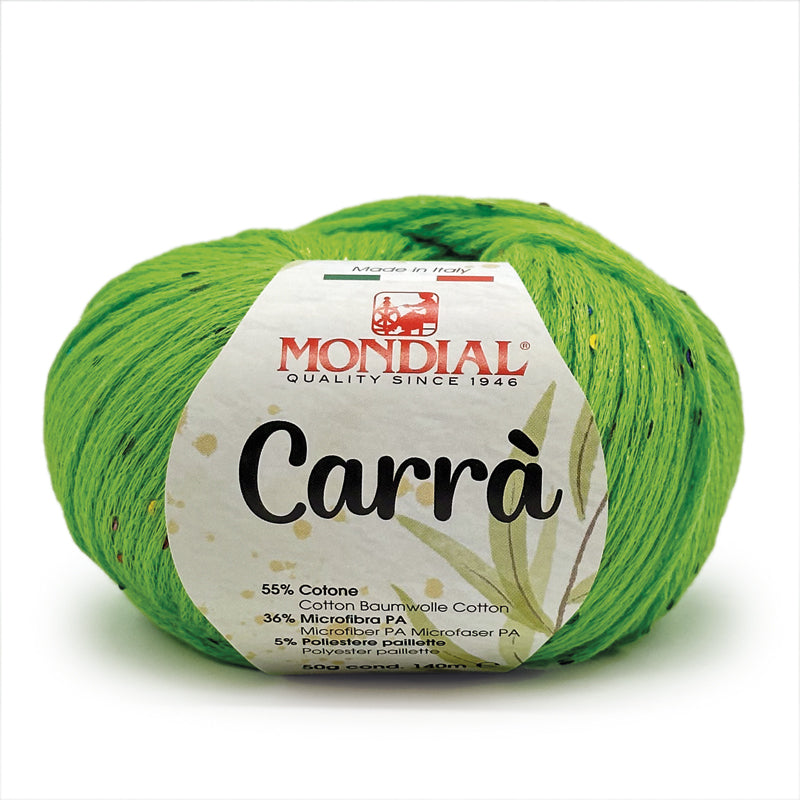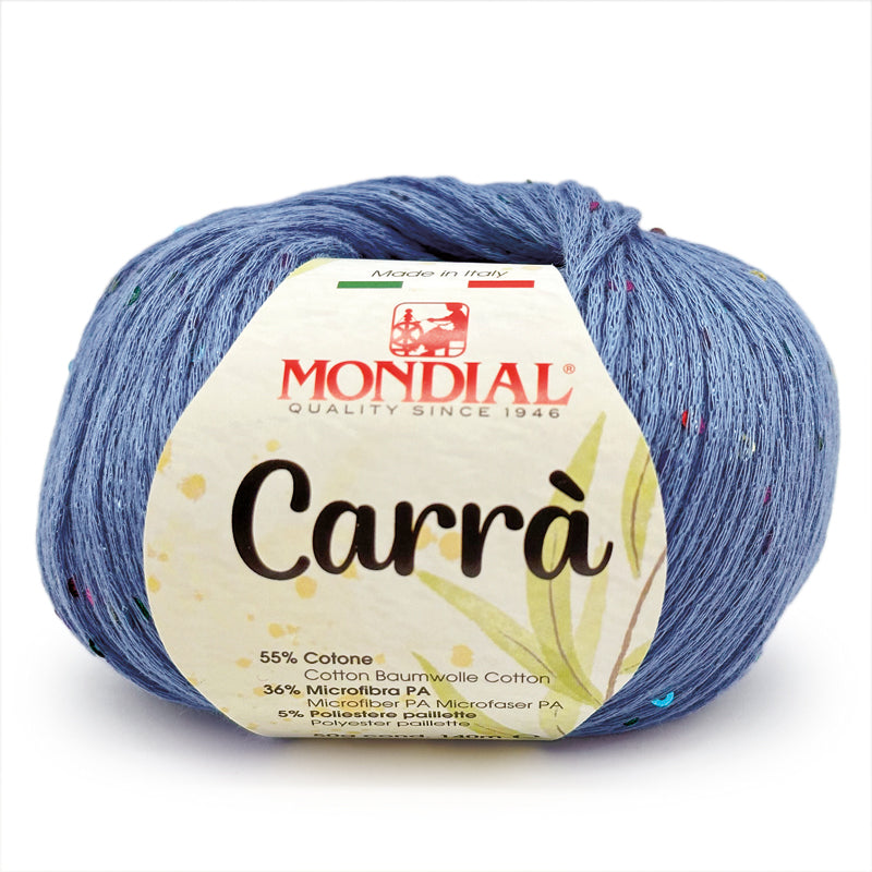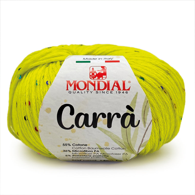 Carrà by Mondial è una catenella di cotone impreziosita da piccole paillettes multicolor; si presta a lavorazioni a maglia per la realizzazione di canotte, cardigan e maglie dal sapore estivo.