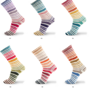 La sua sfumatura intermittente, intervallata da eleganti sezioni écru, dona ai vostri progetti a maglia un effetto visivo unico, soprattutto nei calzini.