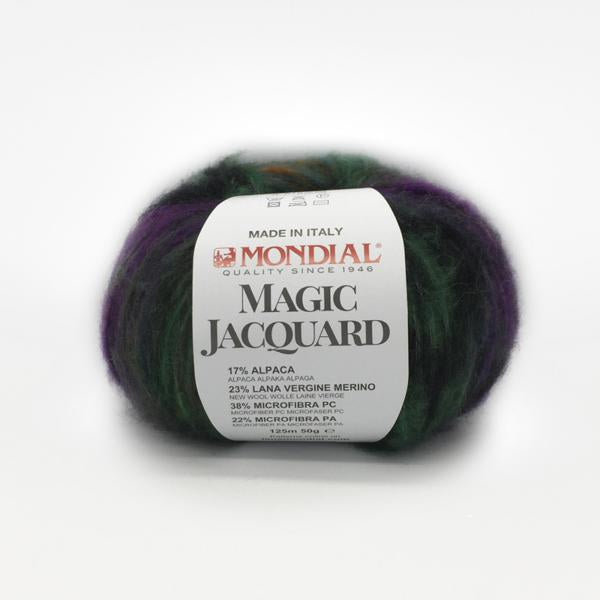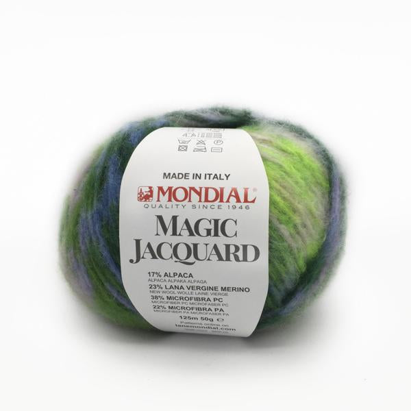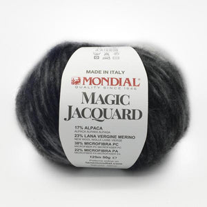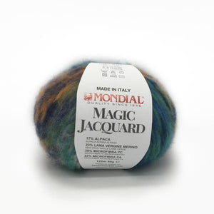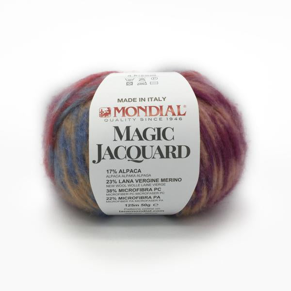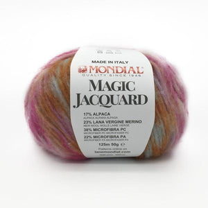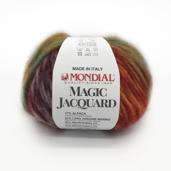 Magic jacquard by Mondial si presenta con colori neutri e accenni di toni fuo, come vuole la tendenza, con abbinamenti di stampa adatti davvero a qualunque gusto. Si presta alla realizzazione di cardigan morbidi ed avvolgenti, maglie, sciarpe e stole di vario genere.